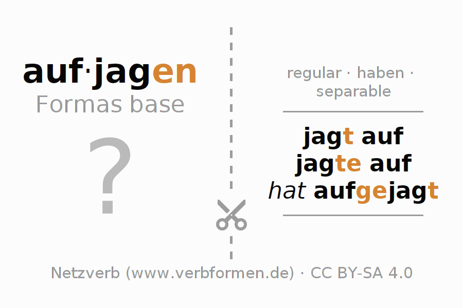 Guía: imprime y corta las cartas de aprendizaje para el verbo aufjagen. Después mezcla y apila cartas con diferentes verbos. Así podrás ir sacando las cartas de una por una. Sin ojear tienes que evocar de tu memoria los datos en las cartas. Para comprobar tus respuestas utiliza la información que aparece en las hojas de aprendizaje.