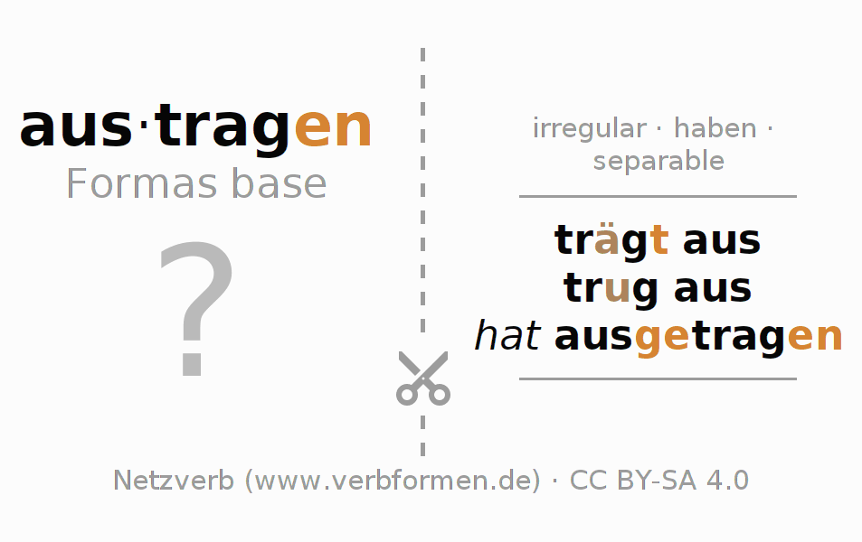 Con las cartas de aprendizaje puedes aprender y practicar cada forma verbal del alemán. Los ejercicios en las hojas de aprendizaje para el verbo austragen están ordenados para que los puedas trabajar en serie. Las formas verbales requeridas se responden evocándolas de tu memoria y al final comparas tus respuestas con los datos en las fichas. Si has contestado correctamente se confirmará así tu aprendizaje, y en caso que las respuestas no concuerden, puedes utilizar los consejos mostrados para memorizar las formas que no conocías. De preferencia imprimes las cartas de aprendizaje y las doblas como está indicado. Así podrás estudiar varios verbos a la vez en forma de columna. También hay varios otros tipos de hojas de trabajo para los verbos. Todo el material de estudio es Open Educational Resources (OER), es decir, libre de licencias CC BY-SA 4.0 y puede ser descargado y utilizado de forma gratuita.