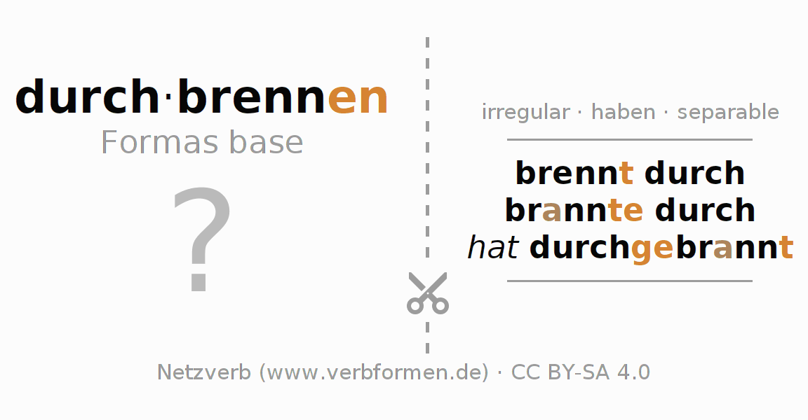 Con las cartas de aprendizaje puedes aprender y practicar cada forma verbal del alemán. Los ejercicios en las hojas de aprendizaje para el verbo durchbrennen están ordenados para que los puedas trabajar en serie. Las formas verbales requeridas se responden evocándolas de tu memoria y al final comparas tus respuestas con los datos en las fichas. Si has contestado correctamente se confirmará así tu aprendizaje, y en caso que las respuestas no concuerden, puedes utilizar los consejos mostrados para memorizar las formas que no conocías. De preferencia imprimes las cartas de aprendizaje y las doblas como está indicado. Así podrás estudiar varios verbos a la vez en forma de columna. También hay varios otros tipos de hojas de trabajo para los verbos. Todo el material de estudio es Open Educational Resources (OER), es decir, libre de licencias CC BY-SA 4.0 y puede ser descargado y utilizado de forma gratuita.