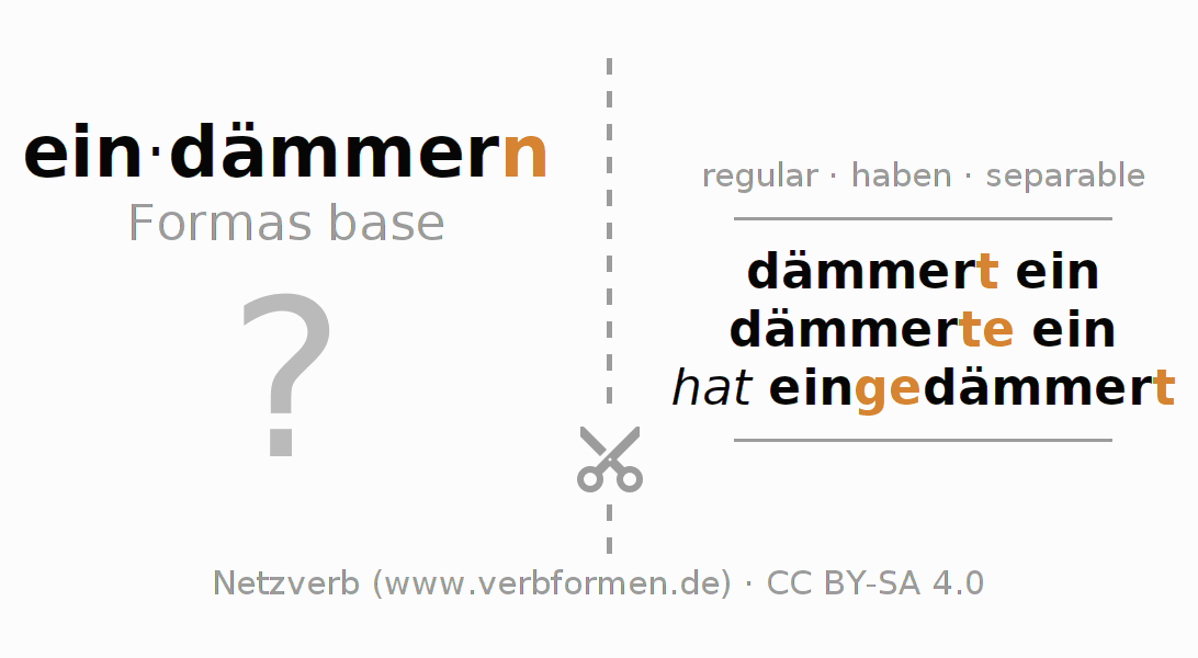 Con las cartas de aprendizaje puedes aprender y practicar cada forma verbal del alemán. Los ejercicios en las hojas de aprendizaje para el verbo eindämmern están ordenados para que los puedas trabajar en serie. Las formas verbales requeridas se responden evocándolas de tu memoria y al final comparas tus respuestas con los datos en las fichas. Si has contestado correctamente se confirmará así tu aprendizaje, y en caso que las respuestas no concuerden, puedes utilizar los consejos mostrados para memorizar las formas que no conocías. De preferencia imprimes las cartas de aprendizaje y las doblas como está indicado. Así podrás estudiar varios verbos a la vez en forma de columna. También hay varios otros tipos de hojas de trabajo para los verbos. Todo el material de estudio es Open Educational Resources (OER), es decir, libre de licencias CC BY-SA 4.0 y puede ser descargado y utilizado de forma gratuita.