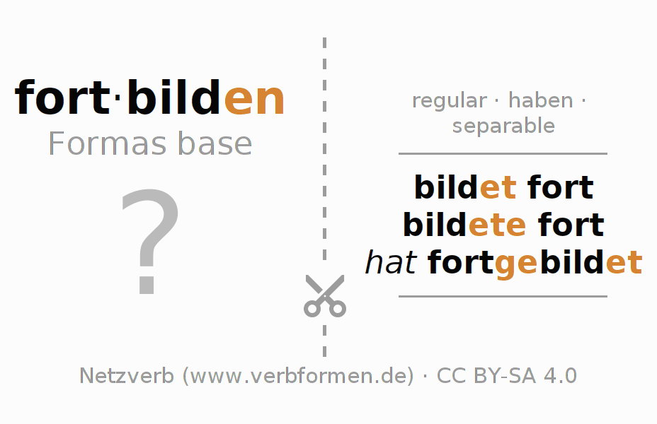 Con las cartas de aprendizaje puedes aprender y practicar cada forma verbal del alemán. Los ejercicios en las hojas de aprendizaje para el verbo fortbilden están ordenados para que los puedas trabajar en serie. Las formas verbales requeridas se responden evocándolas de tu memoria y al final comparas tus respuestas con los datos en las fichas. Si has contestado correctamente se confirmará así tu aprendizaje, y en caso que las respuestas no concuerden, puedes utilizar los consejos mostrados para memorizar las formas que no conocías. De preferencia imprimes las cartas de aprendizaje y las doblas como está indicado. Así podrás estudiar varios verbos a la vez en forma de columna. También hay varios otros tipos de hojas de trabajo para los verbos. Todo el material de estudio es Open Educational Resources (OER), es decir, libre de licencias CC BY-SA 4.0 y puede ser descargado y utilizado de forma gratuita.