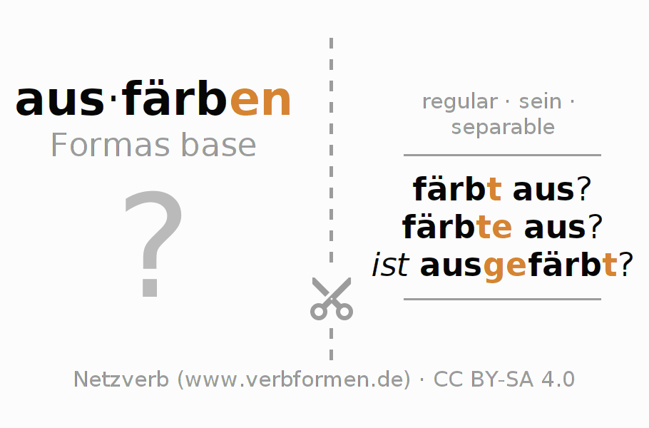 Con las cartas de aprendizaje puedes aprender y practicar cada forma verbal del alemán. Los ejercicios en las hojas de aprendizaje para el verbo ausfärben están ordenados para que los puedas trabajar en serie. Las formas verbales requeridas se responden evocándolas de tu memoria y al final comparas tus respuestas con los datos en las fichas. Si has contestado correctamente se confirmará así tu aprendizaje, y en caso que las respuestas no concuerden, puedes utilizar los consejos mostrados para memorizar las formas que no conocías. De preferencia imprimes las cartas de aprendizaje y las doblas como está indicado. Así podrás estudiar varios verbos a la vez en forma de columna. También hay varios otros tipos de hojas de trabajo para los verbos. Todo el material de estudio es Open Educational Resources (OER), es decir, libre de licencias CC BY-SA 4.0 y puede ser descargado y utilizado de forma gratuita.