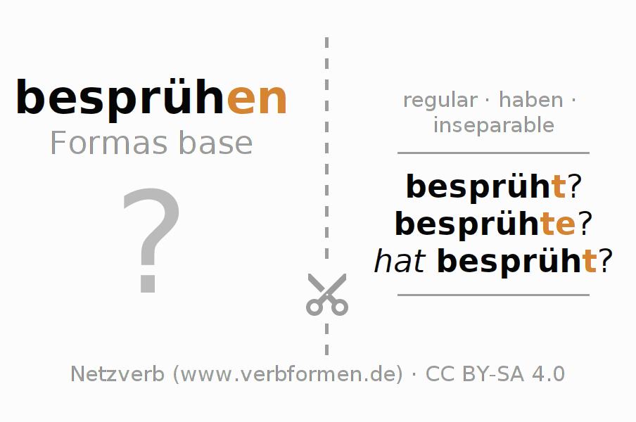 Guía: imprime y corta las cartas de aprendizaje para el verbo besprühen. Después mezcla y apila cartas con diferentes verbos. Así podrás ir sacando las cartas de una por una. Sin ojear tienes que evocar de tu memoria los datos en las cartas. Para comprobar tus respuestas utiliza la información que aparece en las hojas de aprendizaje.