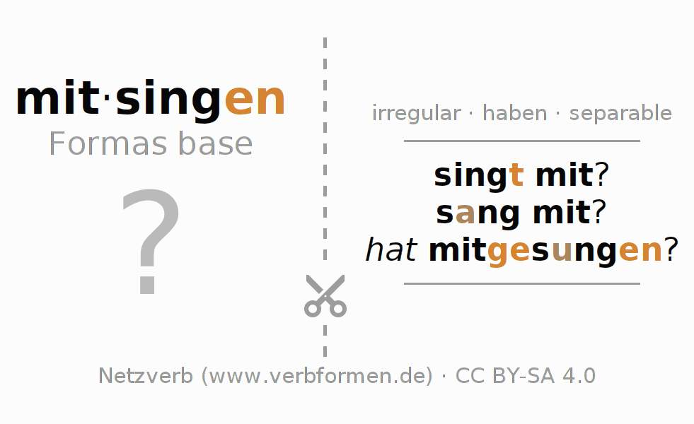 Guía: imprime y corta las cartas de aprendizaje para el verbo mitsingen. Después mezcla y apila cartas con diferentes verbos. Así podrás ir sacando las cartas de una por una. Sin ojear tienes que evocar de tu memoria los datos en las cartas. Para comprobar tus respuestas utiliza la información que aparece en las hojas de aprendizaje.