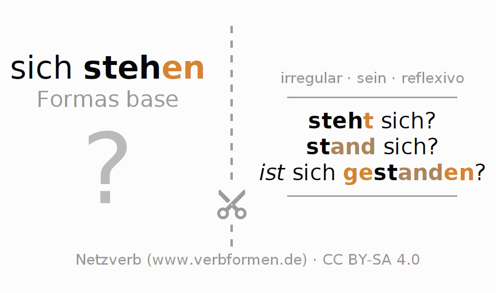 Guía: imprime y corta las cartas de aprendizaje para el verbo sich stehen. Después mezcla y apila cartas con diferentes verbos. Así podrás ir sacando las cartas de una por una. Sin ojear tienes que evocar de tu memoria los datos en las cartas. Para comprobar tus respuestas utiliza la información que aparece en las hojas de aprendizaje.