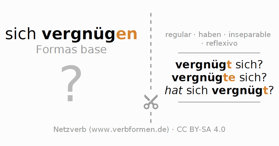 Guía: imprime y corta las cartas de aprendizaje para el verbo sich vergnügen. Después mezcla y apila cartas con diferentes verbos. Así podrás ir sacando las cartas de una por una. Sin ojear tienes que evocar de tu memoria los datos en las cartas. Para comprobar tus respuestas utiliza la información que aparece en las hojas de aprendizaje.