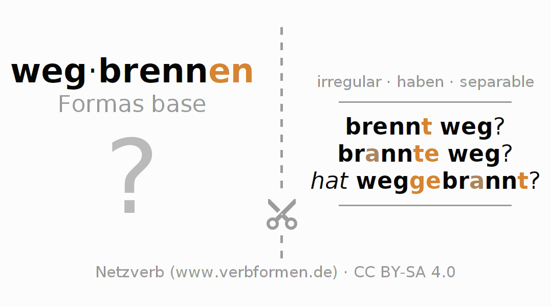 Guía: imprime y corta las cartas de aprendizaje para el verbo wegbrennen. Después mezcla y apila cartas con diferentes verbos. Así podrás ir sacando las cartas de una por una. Sin ojear tienes que evocar de tu memoria los datos en las cartas. Para comprobar tus respuestas utiliza la información que aparece en las hojas de aprendizaje.