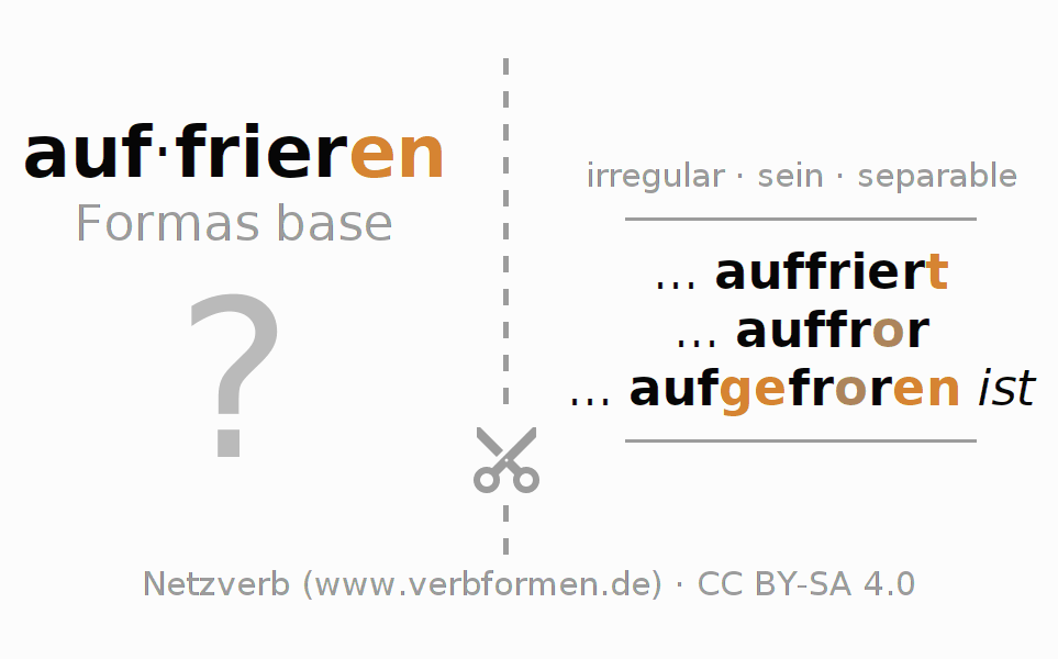 Guía: imprime y corta las cartas de aprendizaje para el verbo auffrieren. Después mezcla y apila cartas con diferentes verbos. Así podrás ir sacando las cartas de una por una. Sin ojear tienes que evocar de tu memoria los datos en las cartas. Para comprobar tus respuestas utiliza la información que aparece en las hojas de aprendizaje.