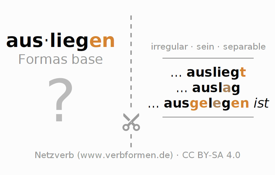 Con las cartas de aprendizaje puedes aprender y practicar cada forma verbal del alemán. Los ejercicios en las hojas de aprendizaje para el verbo ausliegen están ordenados para que los puedas trabajar en serie. Las formas verbales requeridas se responden evocándolas de tu memoria y al final comparas tus respuestas con los datos en las fichas. Si has contestado correctamente se confirmará así tu aprendizaje, y en caso que las respuestas no concuerden, puedes utilizar los consejos mostrados para memorizar las formas que no conocías. De preferencia imprimes las cartas de aprendizaje y las doblas como está indicado. Así podrás estudiar varios verbos a la vez en forma de columna. También hay varios otros tipos de hojas de trabajo para los verbos. Todo el material de estudio es Open Educational Resources (OER), es decir, libre de licencias CC BY-SA 4.0 y puede ser descargado y utilizado de forma gratuita.