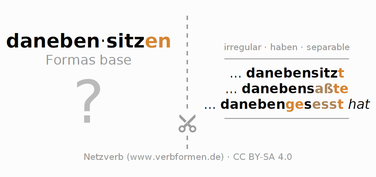 Tarjetas de aprendizaje para la conjugación del verbo alemán danebensitzen