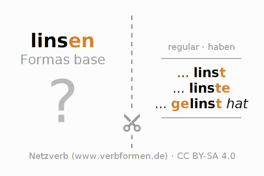 Con las cartas de aprendizaje puedes aprender y practicar cada forma verbal del alemán. Los ejercicios en las hojas de aprendizaje para el verbo linsen están ordenados para que los puedas trabajar en serie. Las formas verbales requeridas se responden evocándolas de tu memoria y al final comparas tus respuestas con los datos en las fichas. Si has contestado correctamente se confirmará así tu aprendizaje, y en caso que las respuestas no concuerden, puedes utilizar los consejos mostrados para memorizar las formas que no conocías. De preferencia imprimes las cartas de aprendizaje y las doblas como está indicado. Así podrás estudiar varios verbos a la vez en forma de columna. También hay varios otros tipos de hojas de trabajo para los verbos. Todo el material de estudio es Open Educational Resources (OER), es decir, libre de licencias CC BY-SA 4.0 y puede ser descargado y utilizado de forma gratuita.
