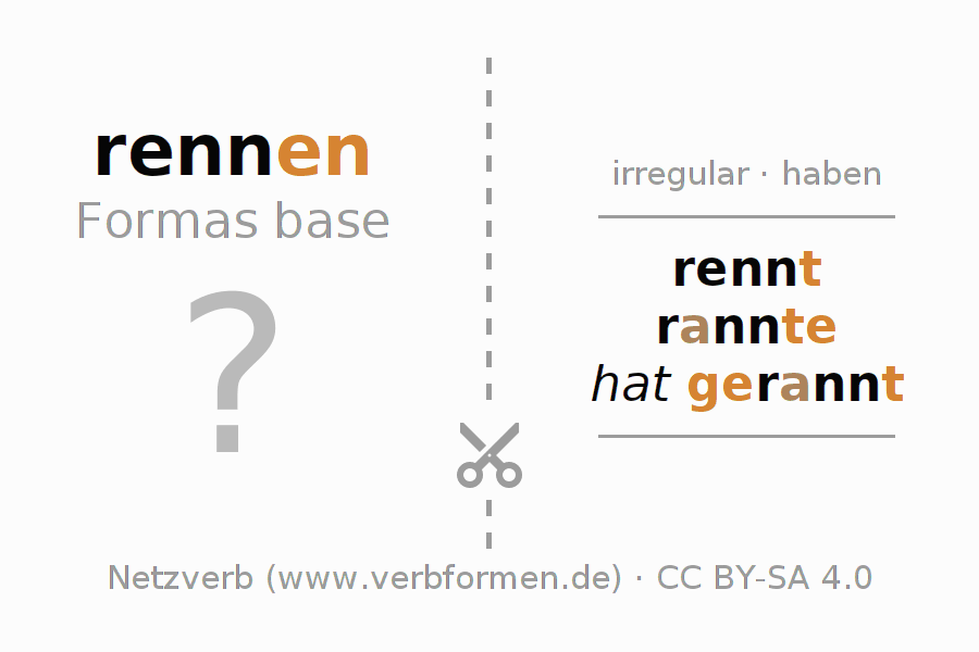 Con las cartas de aprendizaje puedes aprender y practicar cada forma verbal del alemán. Los ejercicios en las hojas de aprendizaje para el verbo rennen están ordenados para que los puedas trabajar en serie. Las formas verbales requeridas se responden evocándolas de tu memoria y al final comparas tus respuestas con los datos en las fichas. Si has contestado correctamente se confirmará así tu aprendizaje, y en caso que las respuestas no concuerden, puedes utilizar los consejos mostrados para memorizar las formas que no conocías. De preferencia imprimes las cartas de aprendizaje y las doblas como está indicado. Así podrás estudiar varios verbos a la vez en forma de columna. También hay varios otros tipos de hojas de trabajo para los verbos. Todo el material de estudio es Open Educational Resources (OER), es decir, libre de licencias CC BY-SA 4.0 y puede ser descargado y utilizado de forma gratuita.