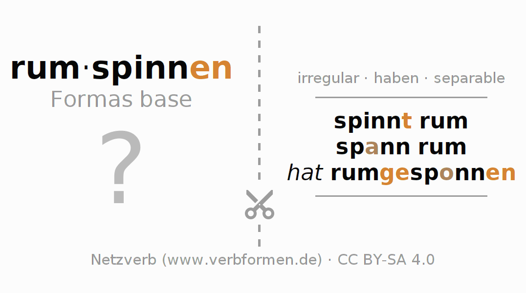 Con las cartas de aprendizaje puedes aprender y practicar cada forma verbal del alemán. Los ejercicios en las hojas de aprendizaje para el verbo rumspinnen están ordenados para que los puedas trabajar en serie. Las formas verbales requeridas se responden evocándolas de tu memoria y al final comparas tus respuestas con los datos en las fichas. Si has contestado correctamente se confirmará así tu aprendizaje, y en caso que las respuestas no concuerden, puedes utilizar los consejos mostrados para memorizar las formas que no conocías. De preferencia imprimes las cartas de aprendizaje y las doblas como está indicado. Así podrás estudiar varios verbos a la vez en forma de columna. También hay varios otros tipos de hojas de trabajo para los verbos. Todo el material de estudio es Open Educational Resources (OER), es decir, libre de licencias CC BY-SA 4.0 y puede ser descargado y utilizado de forma gratuita.