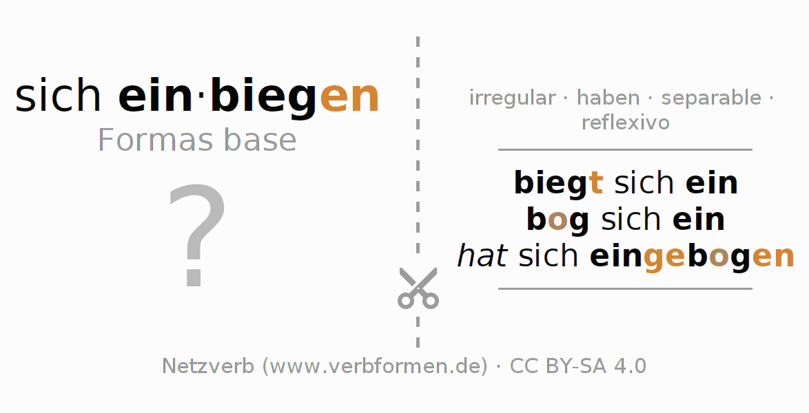 Guía: imprime y corta las cartas de aprendizaje para el verbo sich einbiegen. Después mezcla y apila cartas con diferentes verbos. Así podrás ir sacando las cartas de una por una. Sin ojear tienes que evocar de tu memoria los datos en las cartas. Para comprobar tus respuestas utiliza la información que aparece en las hojas de aprendizaje.