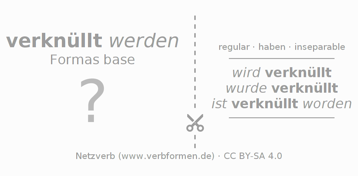 Con las cartas de aprendizaje puedes aprender y practicar cada forma verbal del alemán. Los ejercicios en las hojas de aprendizaje para el verbo verknüllen están ordenados para que los puedas trabajar en serie. Las formas verbales requeridas se responden evocándolas de tu memoria y al final comparas tus respuestas con los datos en las fichas. Si has contestado correctamente se confirmará así tu aprendizaje, y en caso que las respuestas no concuerden, puedes utilizar los consejos mostrados para memorizar las formas que no conocías. De preferencia imprimes las cartas de aprendizaje y las doblas como está indicado. Así podrás estudiar varios verbos a la vez en forma de columna. También hay varios otros tipos de hojas de trabajo para los verbos. Todo el material de estudio es Open Educational Resources (OER), es decir, libre de licencias CC BY-SA 4.0 y puede ser descargado y utilizado de forma gratuita.