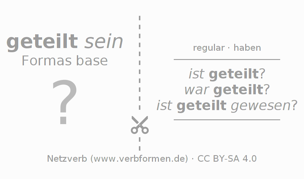 Con las cartas de aprendizaje puedes aprender y practicar cada forma verbal del alemán. Los ejercicios en las hojas de aprendizaje para el verbo teilen están ordenados para que los puedas trabajar en serie. Las formas verbales requeridas se responden evocándolas de tu memoria y al final comparas tus respuestas con los datos en las fichas. Si has contestado correctamente se confirmará así tu aprendizaje, y en caso que las respuestas no concuerden, puedes utilizar los consejos mostrados para memorizar las formas que no conocías. De preferencia imprimes las cartas de aprendizaje y las doblas como está indicado. Así podrás estudiar varios verbos a la vez en forma de columna. También hay varios otros tipos de hojas de trabajo para los verbos. Todo el material de estudio es Open Educational Resources (OER), es decir, libre de licencias CC BY-SA 4.0 y puede ser descargado y utilizado de forma gratuita.