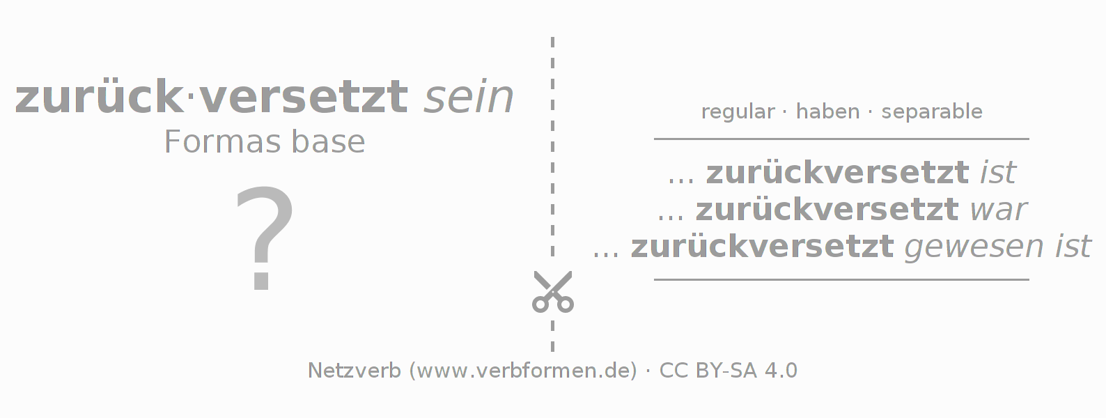 Guía: imprime y corta las cartas de aprendizaje para el verbo zurückversetzen. Después mezcla y apila cartas con diferentes verbos. Así podrás ir sacando las cartas de una por una. Sin ojear tienes que evocar de tu memoria los datos en las cartas. Para comprobar tus respuestas utiliza la información que aparece en las hojas de aprendizaje.
