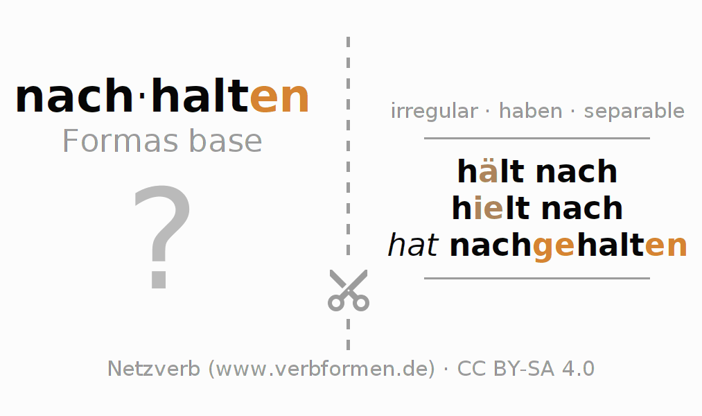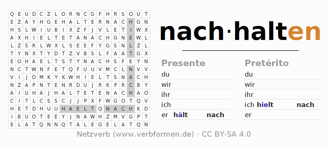 Las hojas de trabajo te ayudan para practicar con la conjugación de los verbos nachhalten en la escuela o de forma autodidacta. El material de estudio es Open Educational Resources (OER), es decir, libre de licencias CC BY-SA 4.0 y pude ser descargado y utilizado de forma gratuita, por ejemplo para la escuela. Con este fin tenemos para ti varios tipos de hojas de trabajo para los verbos nachhalten en forma de tablas de conjugación, acertijos y juegos. Todo el material esta disponible de forma gratuita para descargas PDF, imágenes y paginas web interactivas. Junto con los ejercicios hay innumerables ejemplos nachhalten que te ayudan en el uso de los verbos.