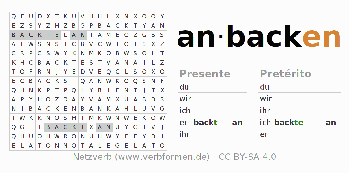 Las hojas de trabajo te ayudan para practicar con la conjugación de los verbos anbacken en la escuela o de forma autodidacta. El material de estudio es Open Educational Resources (OER), es decir, libre de licencias CC BY-SA 4.0 y pude ser descargado y utilizado de forma gratuita, por ejemplo para la escuela. Con este fin tenemos para ti varios tipos de hojas de trabajo para los verbos anbacken (regelm) (hat) en forma de tablas de conjugación, acertijos y juegos. Todo el material esta disponible de forma gratuita para descargas PDF, imágenes y paginas web interactivas. Junto con los ejercicios hay innumerables ejemplos anbacken que te ayudan en el uso de los verbos.