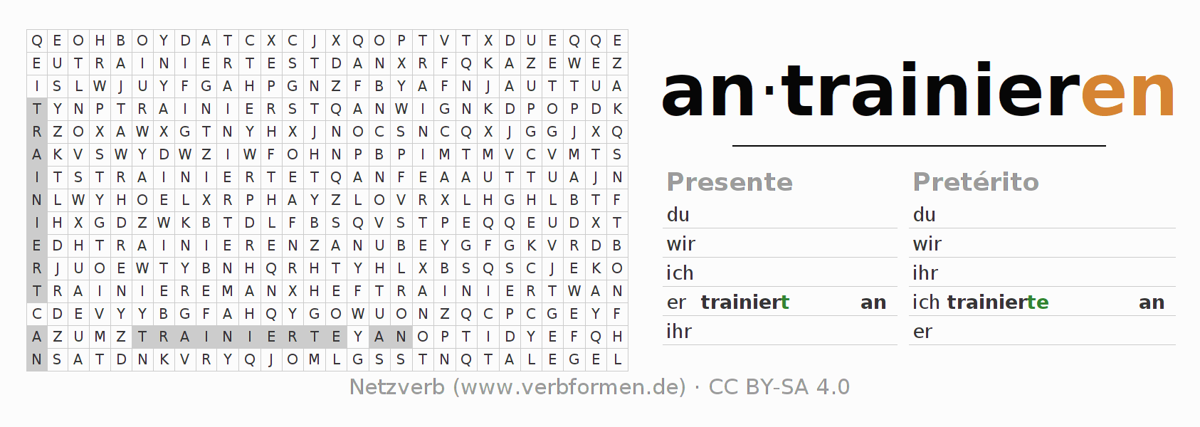 Las hojas de trabajo te ayudan para practicar con la conjugación de los verbos antrainieren en la escuela o de forma autodidacta. El material de estudio es Open Educational Resources (OER), es decir, libre de licencias CC BY-SA 4.0 y pude ser descargado y utilizado de forma gratuita, por ejemplo para la escuela. Con este fin tenemos para ti varios tipos de hojas de trabajo para los verbos antrainieren en forma de tablas de conjugación, acertijos y juegos. Todo el material esta disponible de forma gratuita para descargas PDF, imágenes y paginas web interactivas. Junto con los ejercicios hay innumerables ejemplos antrainieren que te ayudan en el uso de los verbos.