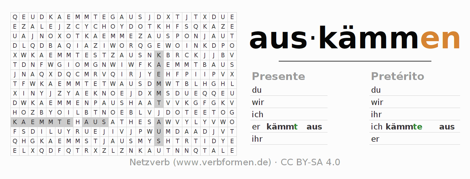 Las hojas de trabajo te ayudan para practicar con la conjugación de los verbos auskämmen en la escuela o de forma autodidacta. El material de estudio es Open Educational Resources (OER), es decir, libre de licencias CC BY-SA 4.0 y pude ser descargado y utilizado de forma gratuita, por ejemplo para la escuela. Con este fin tenemos para ti varios tipos de hojas de trabajo para los verbos auskämmen en forma de tablas de conjugación, acertijos y juegos. Todo el material esta disponible de forma gratuita para descargas PDF, imágenes y paginas web interactivas. Junto con los ejercicios hay innumerables ejemplos auskämmen que te ayudan en el uso de los verbos.