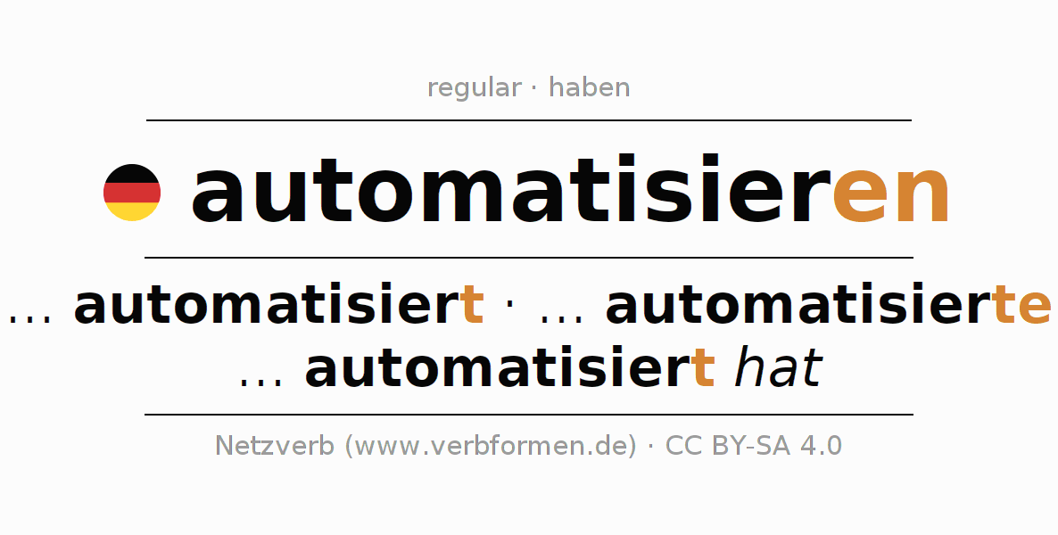 Las hojas de trabajo te ayudan para practicar con la conjugación de los verbos automatisieren en la escuela o de forma autodidacta. El material de estudio es Open Educational Resources (OER), es decir, libre de licencias CC BY-SA 4.0 y pude ser descargado y utilizado de forma gratuita, por ejemplo para la escuela. Con este fin tenemos para ti varios tipos de hojas de trabajo para los verbos automatisieren en forma de tablas de conjugación, acertijos y juegos. Todo el material esta disponible de forma gratuita para descargas PDF, imágenes y paginas web interactivas. Junto con los ejercicios hay innumerables ejemplos automatisieren que te ayudan en el uso de los verbos.