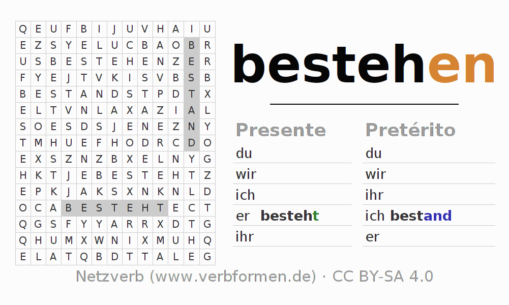 Las hojas de trabajo te ayudan para practicar con la conjugación de los verbos bestehen en la escuela o de forma autodidacta. El material de estudio es Open Educational Resources (OER), es decir, libre de licencias CC BY-SA 4.0 y pude ser descargado y utilizado de forma gratuita, por ejemplo para la escuela. Con este fin tenemos para ti varios tipos de hojas de trabajo para los verbos bestehen en forma de tablas de conjugación, acertijos y juegos. Todo el material esta disponible de forma gratuita para descargas PDF, imágenes y paginas web interactivas. Junto con los ejercicios hay innumerables ejemplos bestehen que te ayudan en el uso de los verbos.