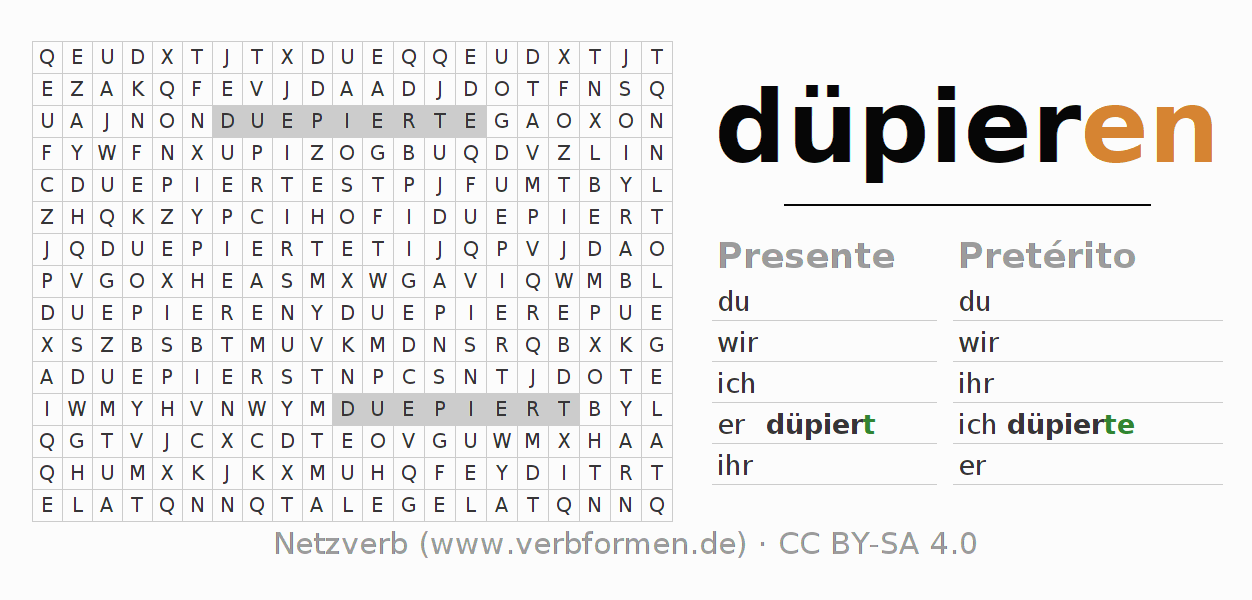 Las hojas de trabajo te ayudan para practicar con la conjugación de los verbos düpieren en la escuela o de forma autodidacta. El material de estudio es Open Educational Resources (OER), es decir, libre de licencias CC BY-SA 4.0 y pude ser descargado y utilizado de forma gratuita, por ejemplo para la escuela. Con este fin tenemos para ti varios tipos de hojas de trabajo para los verbos düpieren en forma de tablas de conjugación, acertijos y juegos. Todo el material esta disponible de forma gratuita para descargas PDF, imágenes y paginas web interactivas. Junto con los ejercicios hay innumerables ejemplos düpieren que te ayudan en el uso de los verbos.