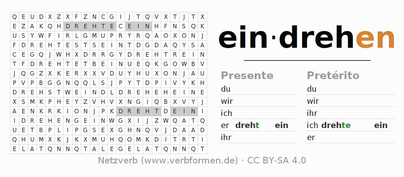 Las hojas de trabajo te ayudan para practicar con la conjugación de los verbos eindrehen en la escuela o de forma autodidacta. El material de estudio es Open Educational Resources (OER), es decir, libre de licencias CC BY-SA 4.0 y pude ser descargado y utilizado de forma gratuita, por ejemplo para la escuela. Con este fin tenemos para ti varios tipos de hojas de trabajo para los verbos eindrehen en forma de tablas de conjugación, acertijos y juegos. Todo el material esta disponible de forma gratuita para descargas PDF, imágenes y paginas web interactivas. Junto con los ejercicios hay innumerables ejemplos eindrehen que te ayudan en el uso de los verbos.