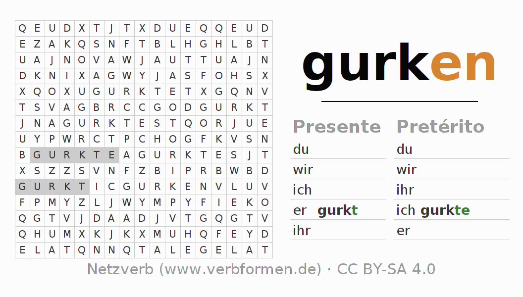 Las hojas de trabajo te ayudan para practicar con la conjugación de los verbos gurken en la escuela o de forma autodidacta. El material de estudio es Open Educational Resources (OER), es decir, libre de licencias CC BY-SA 4.0 y pude ser descargado y utilizado de forma gratuita, por ejemplo para la escuela. Con este fin tenemos para ti varios tipos de hojas de trabajo para los verbos gurken (ist) en forma de tablas de conjugación, acertijos y juegos. Todo el material esta disponible de forma gratuita para descargas PDF, imágenes y paginas web interactivas. Junto con los ejercicios hay innumerables ejemplos gurken que te ayudan en el uso de los verbos.