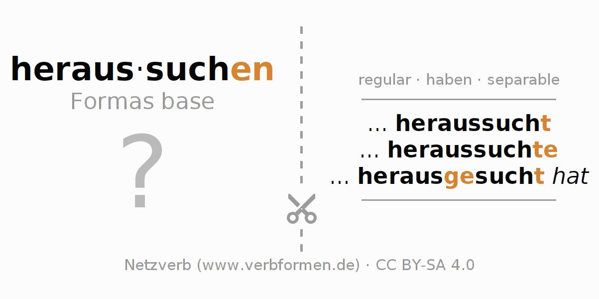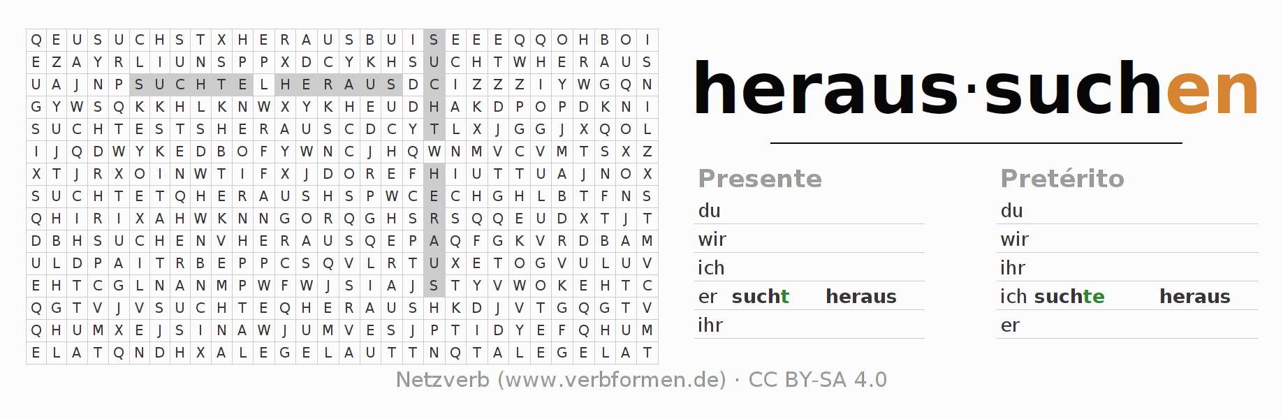 Las hojas de trabajo te ayudan para practicar con la conjugación de los verbos heraussuchen en la escuela o de forma autodidacta. El material de estudio es Open Educational Resources (OER), es decir, libre de licencias CC BY-SA 4.0 y pude ser descargado y utilizado de forma gratuita, por ejemplo para la escuela. Con este fin tenemos para ti varios tipos de hojas de trabajo para los verbos heraussuchen en forma de tablas de conjugación, acertijos y juegos. Todo el material esta disponible de forma gratuita para descargas PDF, imágenes y paginas web interactivas. Junto con los ejercicios hay innumerables ejemplos heraussuchen que te ayudan en el uso de los verbos.