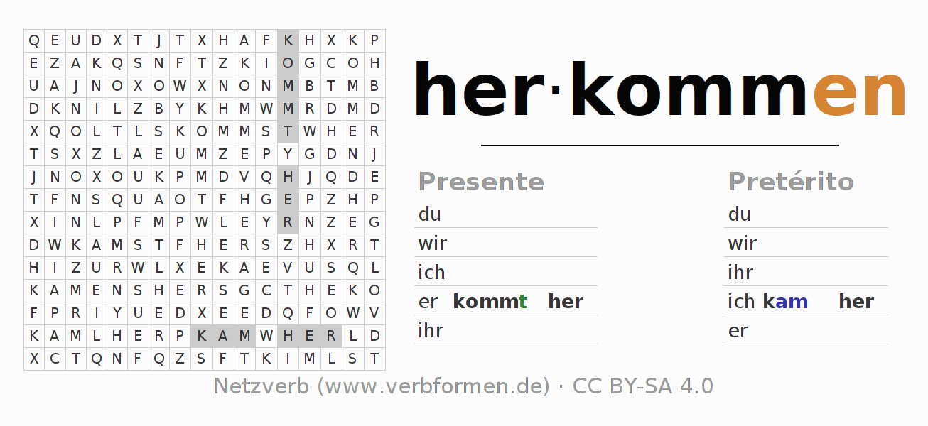 Las hojas de trabajo te ayudan para practicar con la conjugación de los verbos herkommen en la escuela o de forma autodidacta. El material de estudio es Open Educational Resources (OER), es decir, libre de licencias CC BY-SA 4.0 y pude ser descargado y utilizado de forma gratuita, por ejemplo para la escuela. Con este fin tenemos para ti varios tipos de hojas de trabajo para los verbos herkommen en forma de tablas de conjugación, acertijos y juegos. Todo el material esta disponible de forma gratuita para descargas PDF, imágenes y paginas web interactivas. Junto con los ejercicios hay innumerables ejemplos herkommen que te ayudan en el uso de los verbos.