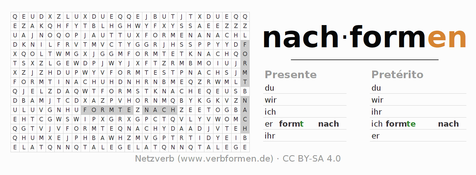 Las hojas de trabajo te ayudan para practicar con la conjugación de los verbos nachformen en la escuela o de forma autodidacta. El material de estudio es Open Educational Resources (OER), es decir, libre de licencias CC BY-SA 4.0 y pude ser descargado y utilizado de forma gratuita, por ejemplo para la escuela. Con este fin tenemos para ti varios tipos de hojas de trabajo para los verbos nachformen en forma de tablas de conjugación, acertijos y juegos. Todo el material esta disponible de forma gratuita para descargas PDF, imágenes y paginas web interactivas. Junto con los ejercicios hay innumerables ejemplos nachformen que te ayudan en el uso de los verbos.