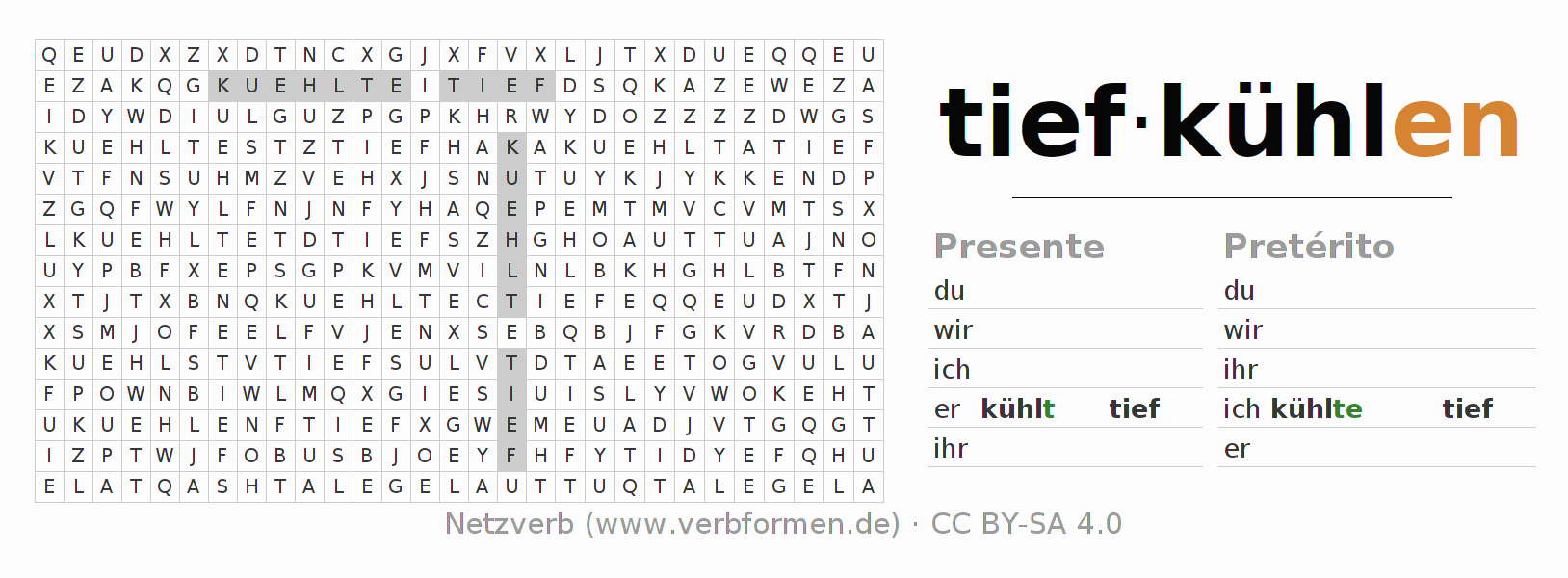 Las hojas de trabajo te ayudan para practicar con la conjugación de los verbos tiefkühlen en la escuela o de forma autodidacta. El material de estudio es Open Educational Resources (OER), es decir, libre de licencias CC BY-SA 4.0 y pude ser descargado y utilizado de forma gratuita, por ejemplo para la escuela. Con este fin tenemos para ti varios tipos de hojas de trabajo para los verbos tiefkühlen en forma de tablas de conjugación, acertijos y juegos. Todo el material esta disponible de forma gratuita para descargas PDF, imágenes y paginas web interactivas. Junto con los ejercicios hay innumerables ejemplos tiefkühlen que te ayudan en el uso de los verbos.