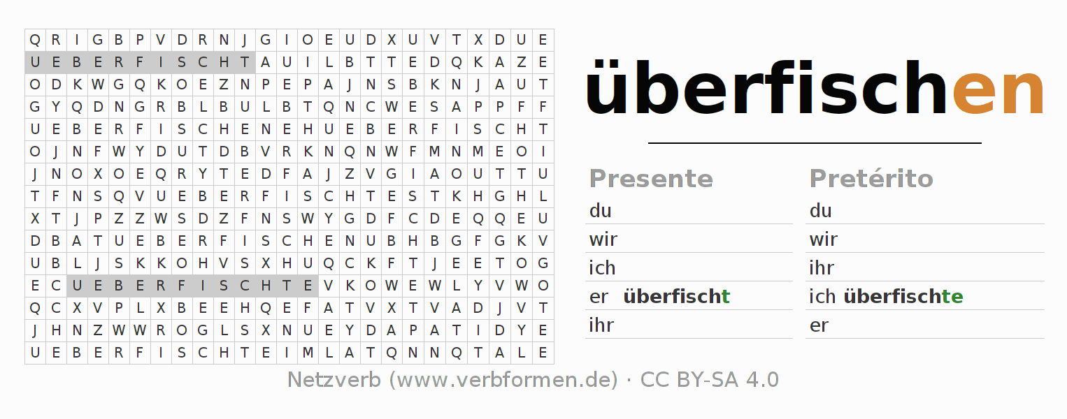 Las hojas de trabajo te ayudan para practicar con la conjugación de los verbos überfischen en la escuela o de forma autodidacta. El material de estudio es Open Educational Resources (OER), es decir, libre de licencias CC BY-SA 4.0 y pude ser descargado y utilizado de forma gratuita, por ejemplo para la escuela. Con este fin tenemos para ti varios tipos de hojas de trabajo para los verbos überfischen en forma de tablas de conjugación, acertijos y juegos. Todo el material esta disponible de forma gratuita para descargas PDF, imágenes y paginas web interactivas. Junto con los ejercicios hay innumerables ejemplos überfischen que te ayudan en el uso de los verbos.