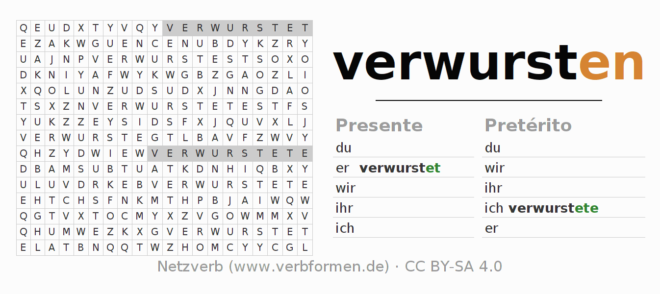 Las hojas de trabajo te ayudan para practicar con la conjugación de los verbos verwursten en la escuela o de forma autodidacta. El material de estudio es Open Educational Resources (OER), es decir, libre de licencias CC BY-SA 4.0 y pude ser descargado y utilizado de forma gratuita, por ejemplo para la escuela. Con este fin tenemos para ti varios tipos de hojas de trabajo para los verbos verwursten en forma de tablas de conjugación, acertijos y juegos. Todo el material esta disponible de forma gratuita para descargas PDF, imágenes y paginas web interactivas. Junto con los ejercicios hay innumerables ejemplos verwursten que te ayudan en el uso de los verbos.