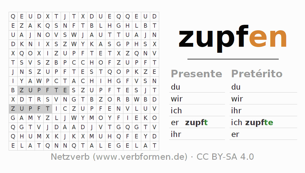 Las hojas de trabajo te ayudan para practicar con la conjugación de los verbos zupfen en la escuela o de forma autodidacta. El material de estudio es Open Educational Resources (OER), es decir, libre de licencias CC BY-SA 4.0 y pude ser descargado y utilizado de forma gratuita, por ejemplo para la escuela. Con este fin tenemos para ti varios tipos de hojas de trabajo para los verbos zupfen en forma de tablas de conjugación, acertijos y juegos. Todo el material esta disponible de forma gratuita para descargas PDF, imágenes y paginas web interactivas. Junto con los ejercicios hay innumerables ejemplos zupfen que te ayudan en el uso de los verbos.