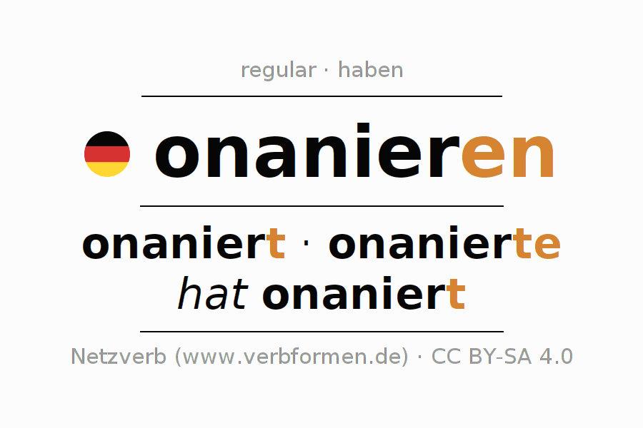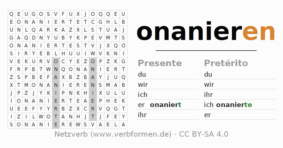 Las hojas de trabajo te ayudan para practicar con la conjugación de los verbos onanieren en la escuela o de forma autodidacta. El material de estudio es Open Educational Resources (OER), es decir, libre de licencias CC BY-SA 4.0 y pude ser descargado y utilizado de forma gratuita, por ejemplo para la escuela. Con este fin tenemos para ti varios tipos de hojas de trabajo para los verbos onanieren en forma de tablas de conjugación, acertijos y juegos. Todo el material esta disponible de forma gratuita para descargas PDF, imágenes y paginas web interactivas. Junto con los ejercicios hay innumerables ejemplos onanieren que te ayudan en el uso de los verbos.