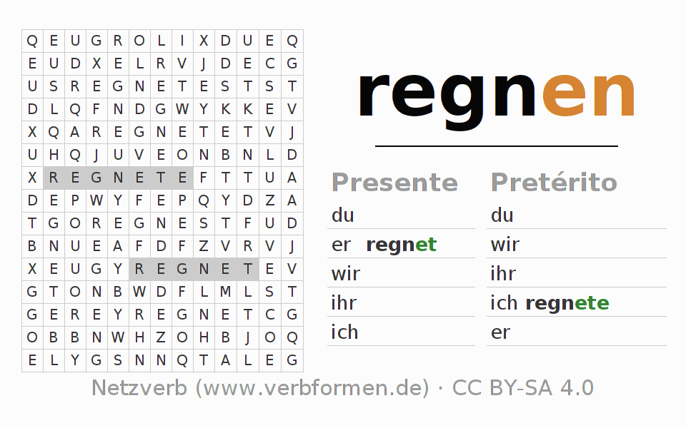 Las hojas de trabajo te ayudan para practicar con la conjugación de los verbos regnen en la escuela o de forma autodidacta. El material de estudio es Open Educational Resources (OER), es decir, libre de licencias CC BY-SA 4.0 y pude ser descargado y utilizado de forma gratuita, por ejemplo para la escuela. Con este fin tenemos para ti varios tipos de hojas de trabajo para los verbos regnen (ist) en forma de tablas de conjugación, acertijos y juegos. Todo el material esta disponible de forma gratuita para descargas PDF, imágenes y paginas web interactivas. Junto con los ejercicios hay innumerables ejemplos regnen que te ayudan en el uso de los verbos.