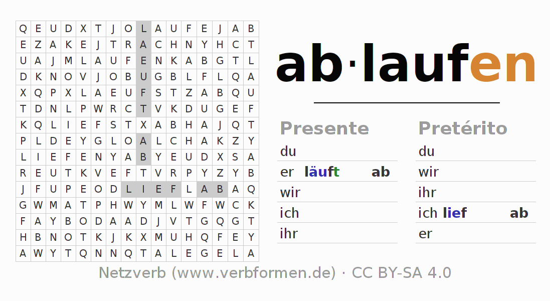 Con el juego de palabras cruzadas (Wortsuchrätsel o Suchsel) puedes aprender las conjugaciones alemanas. Tienes que armar cada una de las formas verbales para después encontrarlas dentro de una sopa de letras. También puedes proceder de forma contraria. Una vez que encuentras un verbo conjugado, tienes que descubrir a qué forma verbal pertenece. Para descargar e imprimir, puedes acceder por aquí a una versión en PDF-Versión o también como imagen. También hay muchas otras hojas de ejercicios para los verbos ablaufen. Todo el material de estudio es Open Educational Resources (OER), es decir, libre de licencias CC BY-SA 4.0 y puede ser descargado y utilizado de forma gratuita. En este link en la sección de ayuda encuentras más información Poner en práctica las sopas de letras en el aula y el autoaprendizaje..