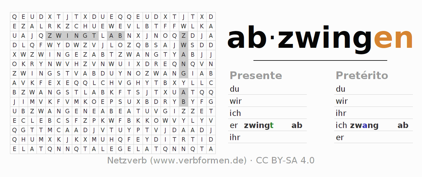 Con el juego de palabras cruzadas (Wortsuchrätsel o Suchsel) puedes aprender las conjugaciones alemanas. Tienes que armar cada una de las formas verbales para después encontrarlas dentro de una sopa de letras. También puedes proceder de forma contraria. Una vez que encuentras un verbo conjugado, tienes que descubrir a qué forma verbal pertenece. Para descargar e imprimir, puedes acceder por aquí a una versión en PDF-Versión o también como imagen. También hay muchas otras hojas de ejercicios para los verbos abzwingen. Todo el material de estudio es Open Educational Resources (OER), es decir, libre de licencias CC BY-SA 4.0 y puede ser descargado y utilizado de forma gratuita. En este link en la sección de ayuda encuentras más información Poner en práctica las sopas de letras en el aula y el autoaprendizaje..