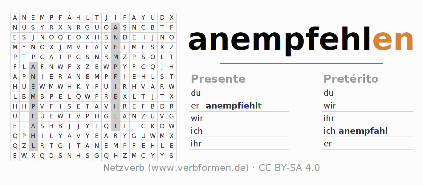 Guía: forma las construcciones correctas para el verbo anempfehlen y encuéntralas en el acertijo. O también encuentra la conjugación de anempfehlen en la sopa de letras y ordénala en la construcción verbal correcta. Las diéresis y el ß aparecen escritos como: ss (ß), oe (ö), ae (ä) y ue (ü).La solución se encuentra al final de la página.