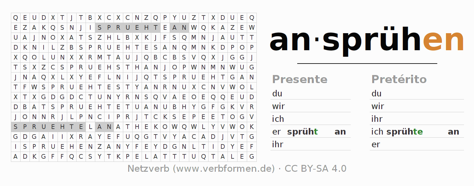 Guía: forma las construcciones correctas para el verbo ansprühen y encuéntralas en el acertijo. O también encuentra la conjugación de ansprühen en la sopa de letras y ordénala en la construcción verbal correcta. Las diéresis y el ß aparecen escritos como: ss (ß), oe (ö), ae (ä) y ue (ü).La solución se encuentra al final de la página.