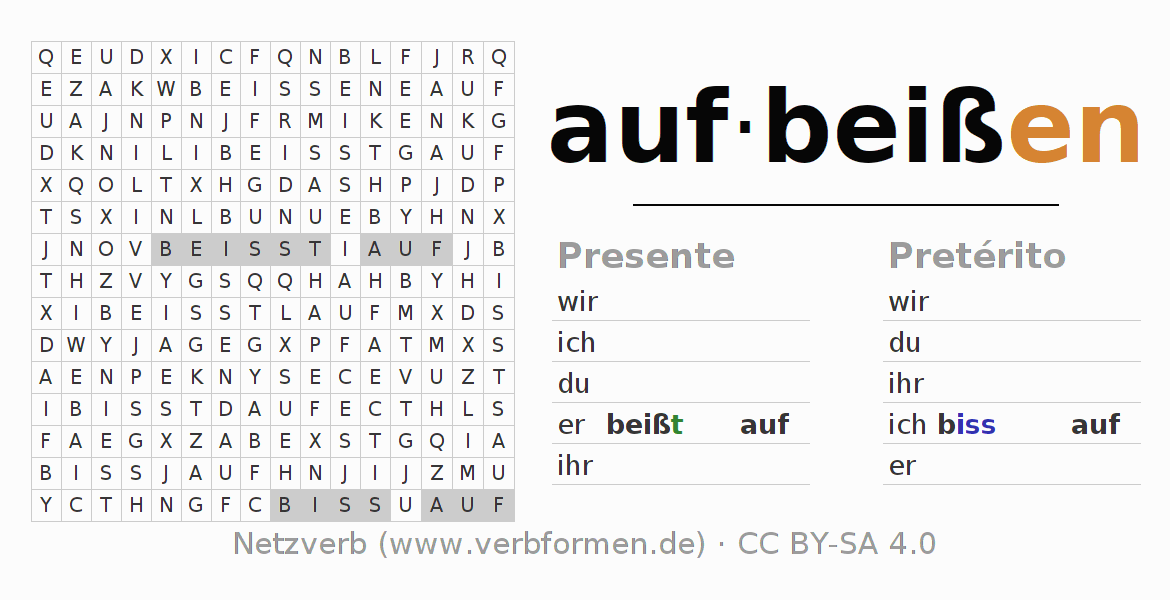 Guía: forma las construcciones correctas para el verbo aufbeißen y encuéntralas en el acertijo. O también encuentra la conjugación de aufbeißen en la sopa de letras y ordénala en la construcción verbal correcta. Las diéresis y el ß aparecen escritos como: ss (ß), oe (ö), ae (ä) y ue (ü).La solución se encuentra al final de la página.