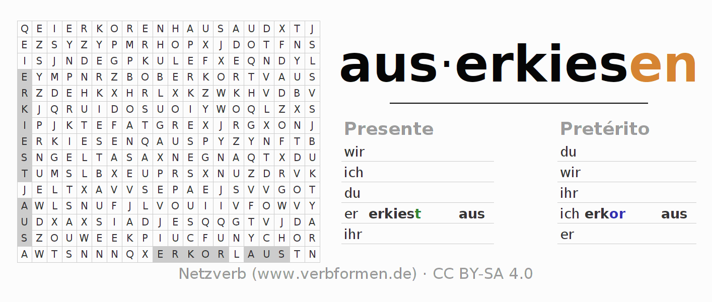 Guía: forma las construcciones correctas para el verbo auserkiesen y encuéntralas en el acertijo. O también encuentra la conjugación de auserkiesen en la sopa de letras y ordénala en la construcción verbal correcta. Las diéresis y el ß aparecen escritos como: ss (ß), oe (ö), ae (ä) y ue (ü).La solución se encuentra al final de la página.