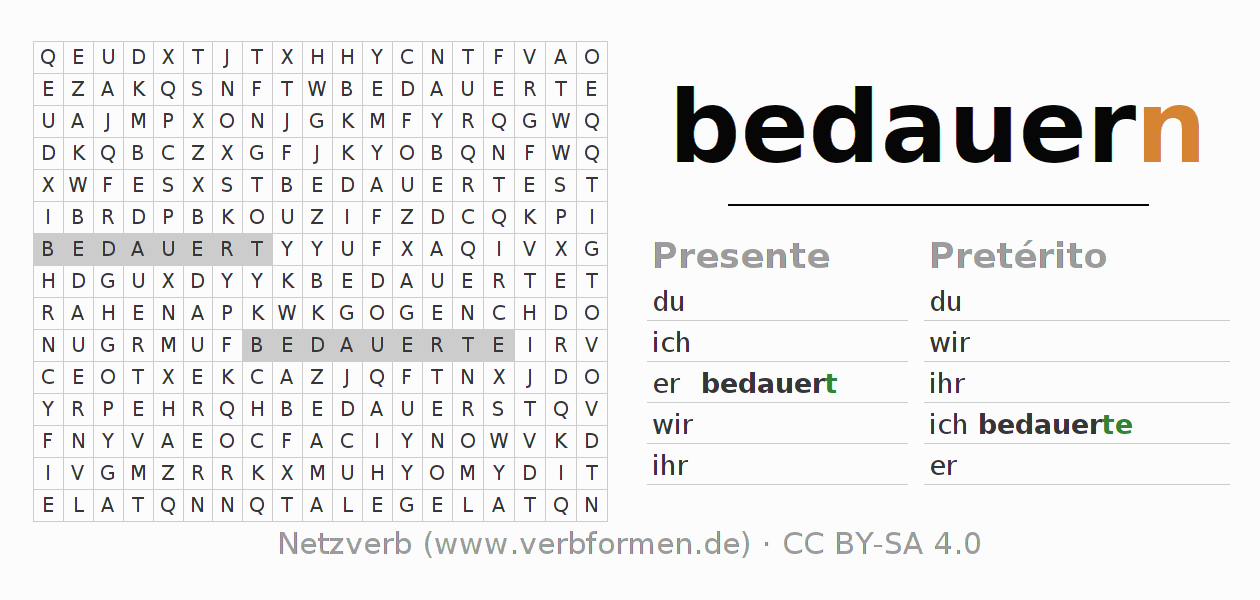 Con el juego de palabras cruzadas (Wortsuchrätsel o Suchsel) puedes aprender las conjugaciones alemanas. Tienes que armar cada una de las formas verbales para después encontrarlas dentro de una sopa de letras. También puedes proceder de forma contraria. Una vez que encuentras un verbo conjugado, tienes que descubrir a qué forma verbal pertenece. Para descargar e imprimir, puedes acceder por aquí a una versión en PDF-Versión o también como imagen. También hay muchas otras hojas de ejercicios para los verbos bedauern. Todo el material de estudio es Open Educational Resources (OER), es decir, libre de licencias CC BY-SA 4.0 y puede ser descargado y utilizado de forma gratuita. En este link en la sección de ayuda encuentras más información Poner en práctica las sopas de letras en el aula y el autoaprendizaje..