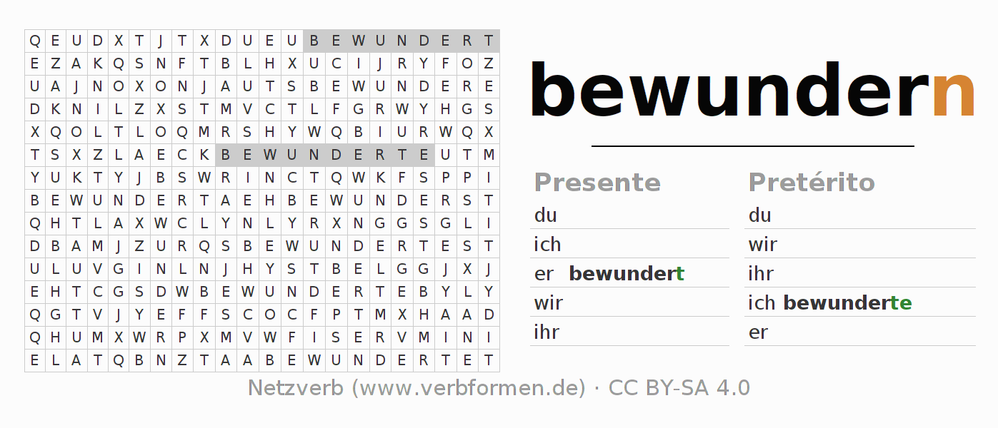 Con el juego de palabras cruzadas (Wortsuchrätsel o Suchsel) puedes aprender las conjugaciones alemanas. Tienes que armar cada una de las formas verbales para después encontrarlas dentro de una sopa de letras. También puedes proceder de forma contraria. Una vez que encuentras un verbo conjugado, tienes que descubrir a qué forma verbal pertenece. Para descargar e imprimir, puedes acceder por aquí a una versión en PDF-Versión o también como imagen. También hay muchas otras hojas de ejercicios para los verbos bewundern. Todo el material de estudio es Open Educational Resources (OER), es decir, libre de licencias CC BY-SA 4.0 y puede ser descargado y utilizado de forma gratuita. En este link en la sección de ayuda encuentras más información Poner en práctica las sopas de letras en el aula y el autoaprendizaje..