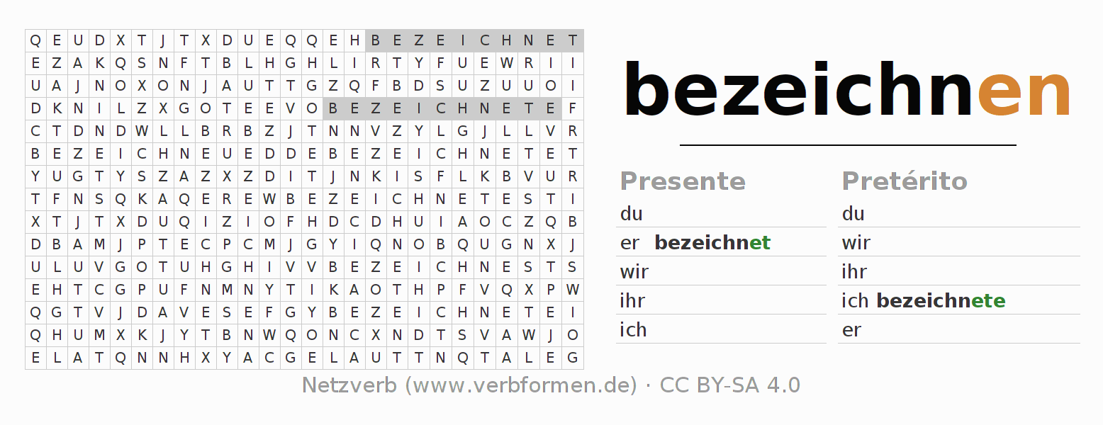 Guía: forma las construcciones correctas para el verbo bezeichnen y encuéntralas en el acertijo. O también encuentra la conjugación de bezeichnen en la sopa de letras y ordénala en la construcción verbal correcta. Las diéresis y el ß aparecen escritos como: ss (ß), oe (ö), ae (ä) y ue (ü).La solución se encuentra al final de la página.