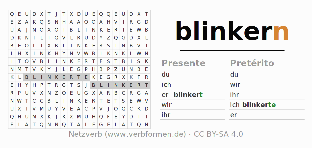 Guía: forma las construcciones correctas para el verbo blinkern y encuéntralas en el acertijo. O también encuentra la conjugación de blinkern en la sopa de letras y ordénala en la construcción verbal correcta. Las diéresis y el ß aparecen escritos como: ss (ß), oe (ö), ae (ä) y ue (ü).La solución se encuentra al final de la página.