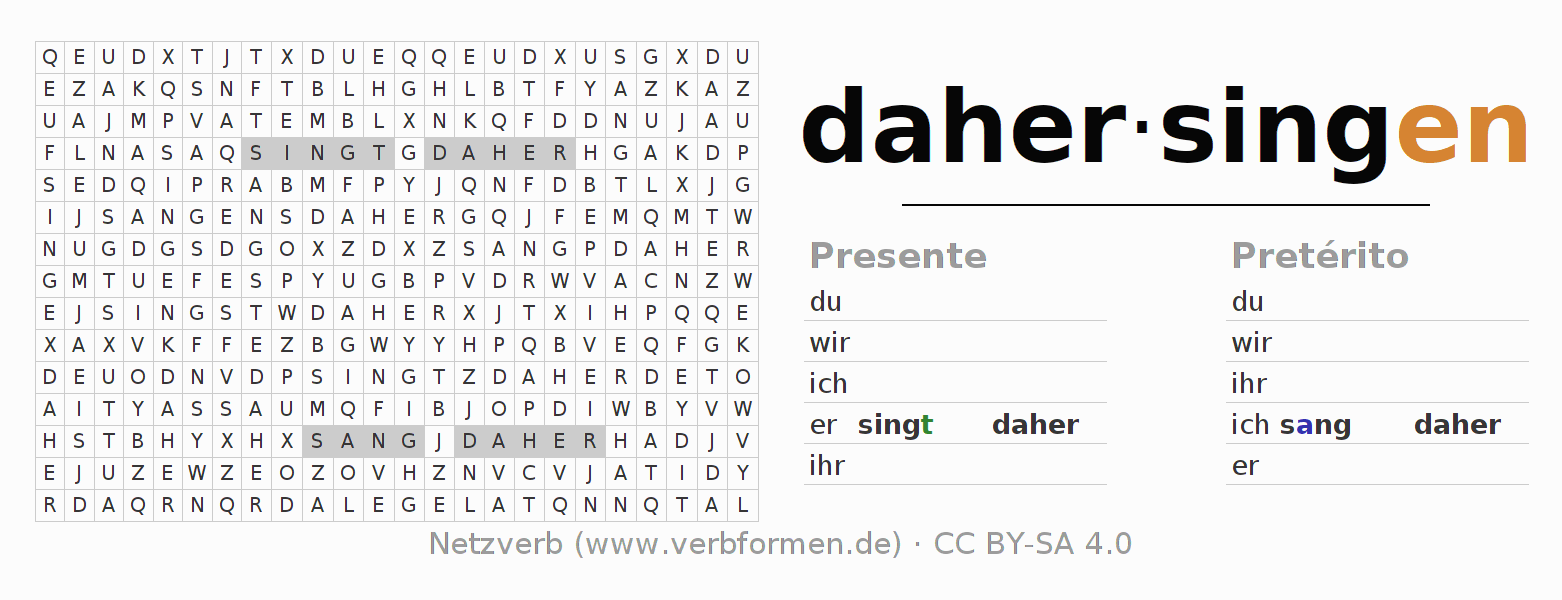 Guía: forma las construcciones correctas para el verbo dahersingen y encuéntralas en el acertijo. O también encuentra la conjugación de dahersingen en la sopa de letras y ordénala en la construcción verbal correcta. Las diéresis y el ß aparecen escritos como: ss (ß), oe (ö), ae (ä) y ue (ü).La solución se encuentra al final de la página.
